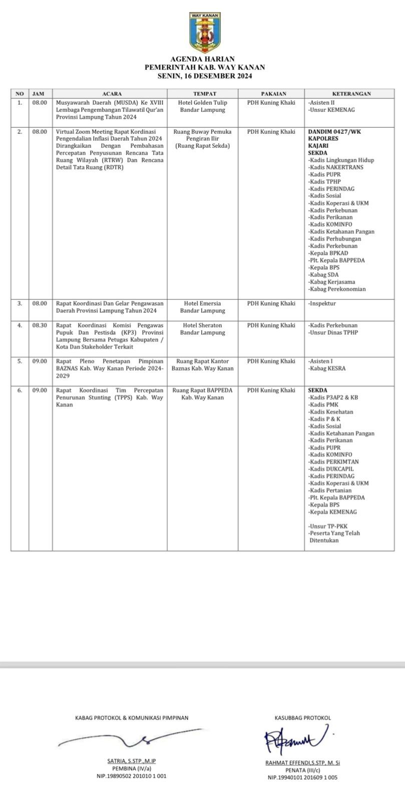 Agenda Harian Pemerintah Daerah Kabupaten Way Kanan 19 Desember 2024